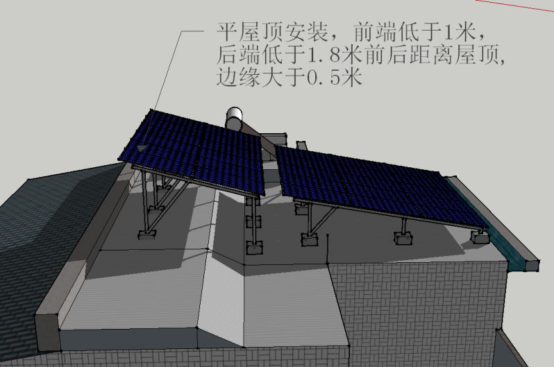 坡屋頂部分加裝太陽能光伏系統(tǒng),原則上貼現(xiàn)有坡屋頂結(jié)構(gòu)架設(shè)且不得超出屋頂范圍。平屋面加裝太陽能光伏系統(tǒng),直接架設(shè)在平屋頂上,且低端距屋面高度小于1.0米、高端距屋面高度小于1.8米、與平屋頂邊緣(女兒墻)距離大于0.5米。